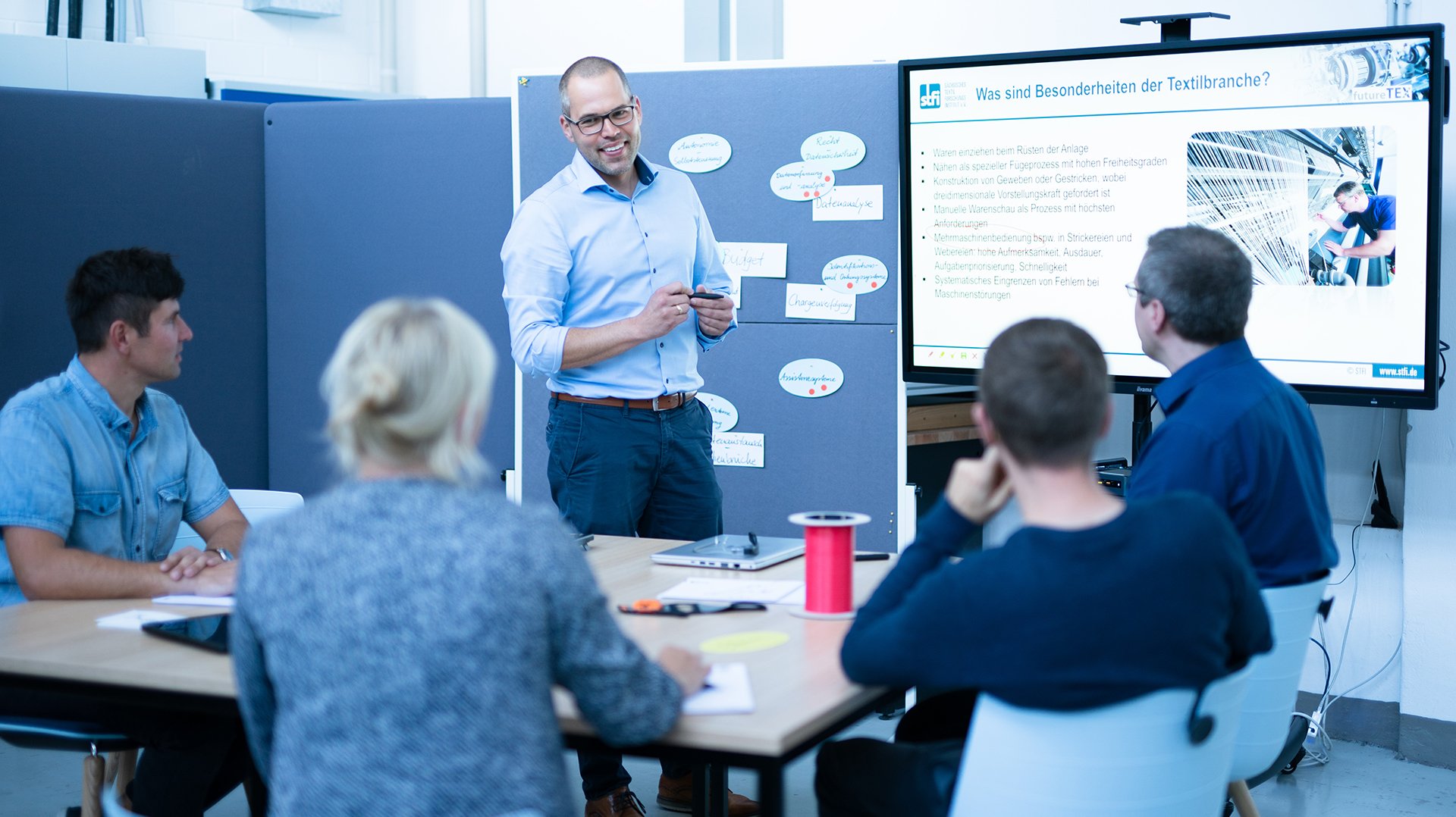 You can move freely around the room virtually and view individual plant technologies at close range. In the "Textile Factory of the Future", STFI scientists are working on topics related to digitalisation in the textile industry. Digital assistance systems, robotics, driverless transport systems and RFID technologies are the main components of the work in this field.