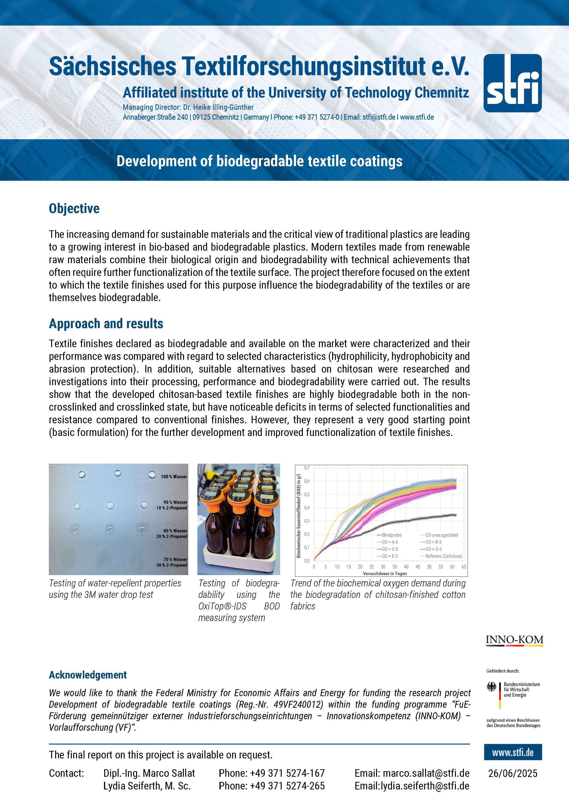 Under the motto ‘Shaping the future now’, the Sächsisches Textilforschungsinstitut e.V. (STFI) is presenting two pioneering textile developments at this year's Innovation Day for SMEs organised by the Federal Ministry for Economic Affairs and Energy (BMWE). The event will take place as an open-air trade fair on the outdoor grounds of AiF Projekt GmbH in Berlin-Pankow and offers small and medium-sized companies a platform to present their innovative projects and results, which have been supported by the BMWE's open-topic innovation funding programme.
