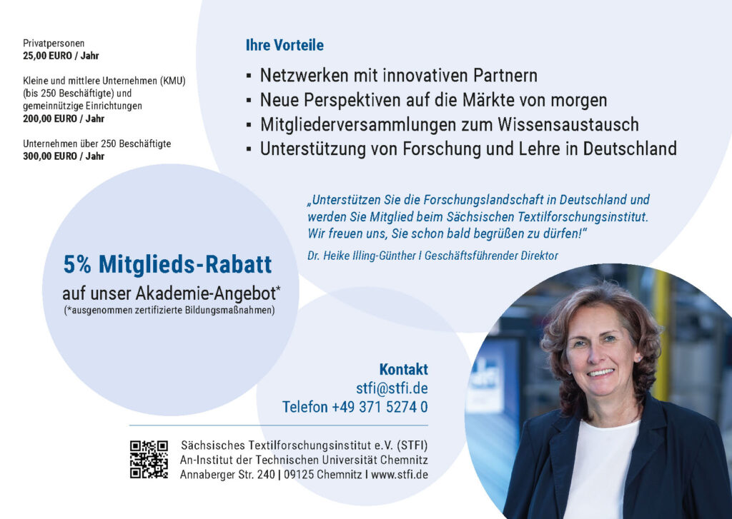 Sie haben Interesse die Zukunft der Textilbranche mit uns zu gestalten und Innovation auf dem Weg in den Markt zu begleiten?Nutzen Sie das internationale Netzwerk unseres Hauses und erhalten Sie zusätzlich vergünstigte Tarife auf unsere nicht zertifzierten Akademiekurse. Werden Sie Mitglied des STFI!