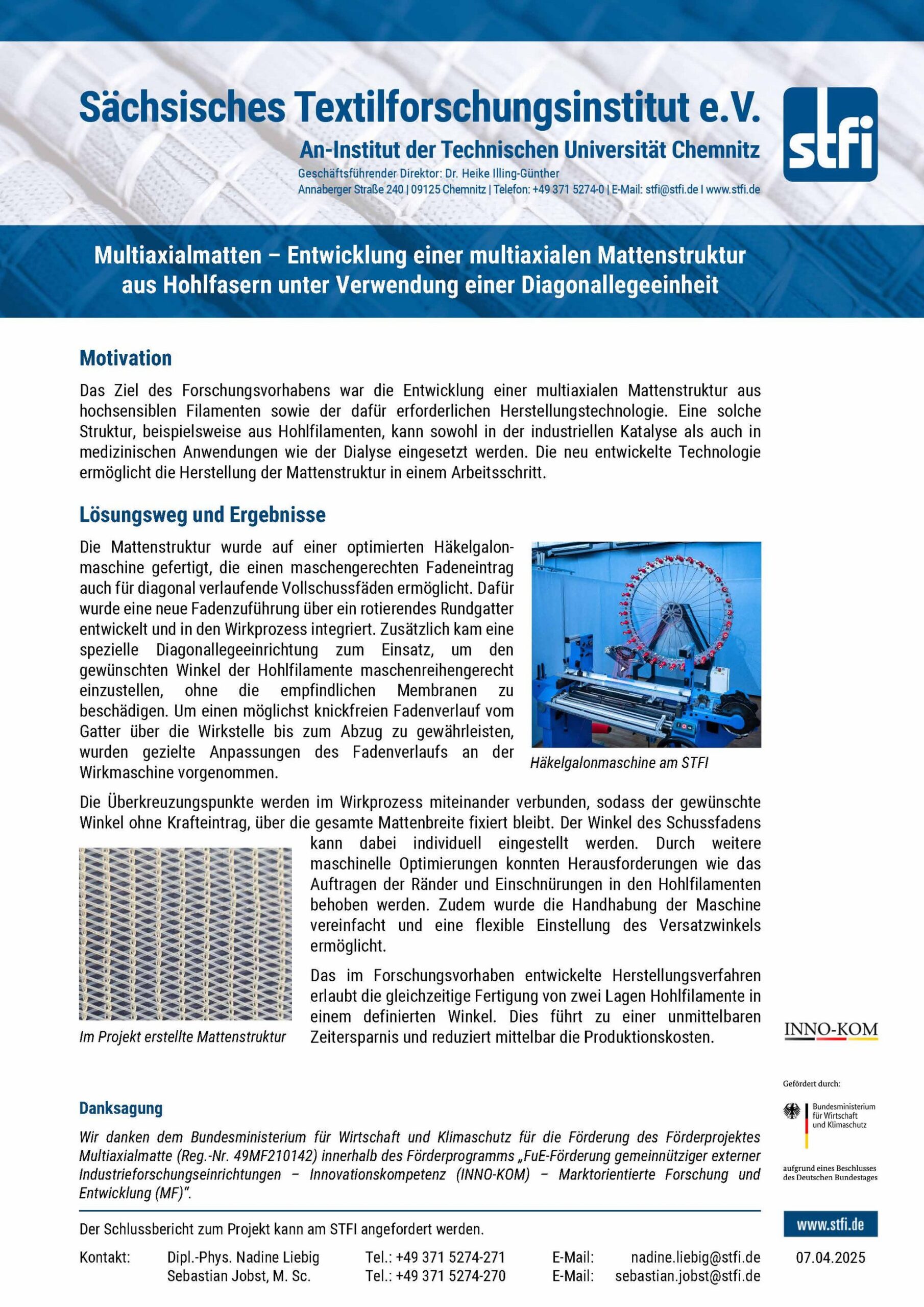 Das Ziel des Forschungsvorhabens war die Entwicklung einer multiaxialen Mattenstruktur aus hochsensiblen Filamenten sowie der dafür erforderlichen Herstellungstechnologie. Eine solche Struktur, beispielsweise aus Hohlfilamenten, kann sowohl in der industriellen Katalyse als auch in medizinischen Anwendungen wie der Dialyse eingesetzt werden. Die neu entwickelte Technologie ermöglicht die Herstellung der Mattenstruktur in einem Arbeitsschritt.