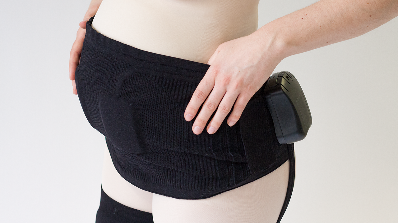Um die Waschbarkeit des Gurtes zu gewährleisten, wurden textile Elektroden entwickelt, welche direkt im Gurtsystem fixiert werden. Durch eine besondere textile Konstruktion kann sich der Gurt während der Nutzung an den geringer werdenden Umfang der Trägerin anpassen, so dass die Elektroden auch nach längerer Anwendung und Gewichtsverlust immer noch an den entsprechenden Körperstellen sitzen. Die akkubetriebene Steuerung wurde weitestgehend miniaturisiert, so dass diese am Gurt befestigt werden kann. Mit einer abnehmbaren Fernbedienung kann die Trägerin ein Programm auswählen und die Intensität regulieren. Von Vorteil ist zudem, dass das gesamte System leicht anzulegen und intuitiv zu bedienen ist. Für die Anwendung zu Hause ist der Sportgurt bestens geeignet, da er die Bewegungsfreiheit nicht einschränkt und es erlaubt, die Rückbildung einfach in den Alltag mit einem Säugling zu integrieren.