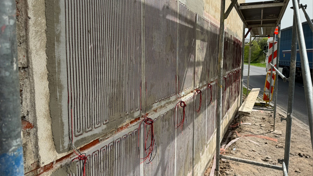 Der Lösungsweg fokussiert deshalb eine thermische Aktivierung mittels elektrisch leitfähiger Gitterstrukturen, die in die äußere Putzschicht eingebracht werden und gleichzeitig als Putzträger dienen. Der Einsatz elektrischer Heizelemente ermöglicht eine ortsgenaue und zielgerichtete künstliche Erwärmung der Gebäudehülle, wobei der Einsatz sich dabei in Echtzeit steuern lässt.