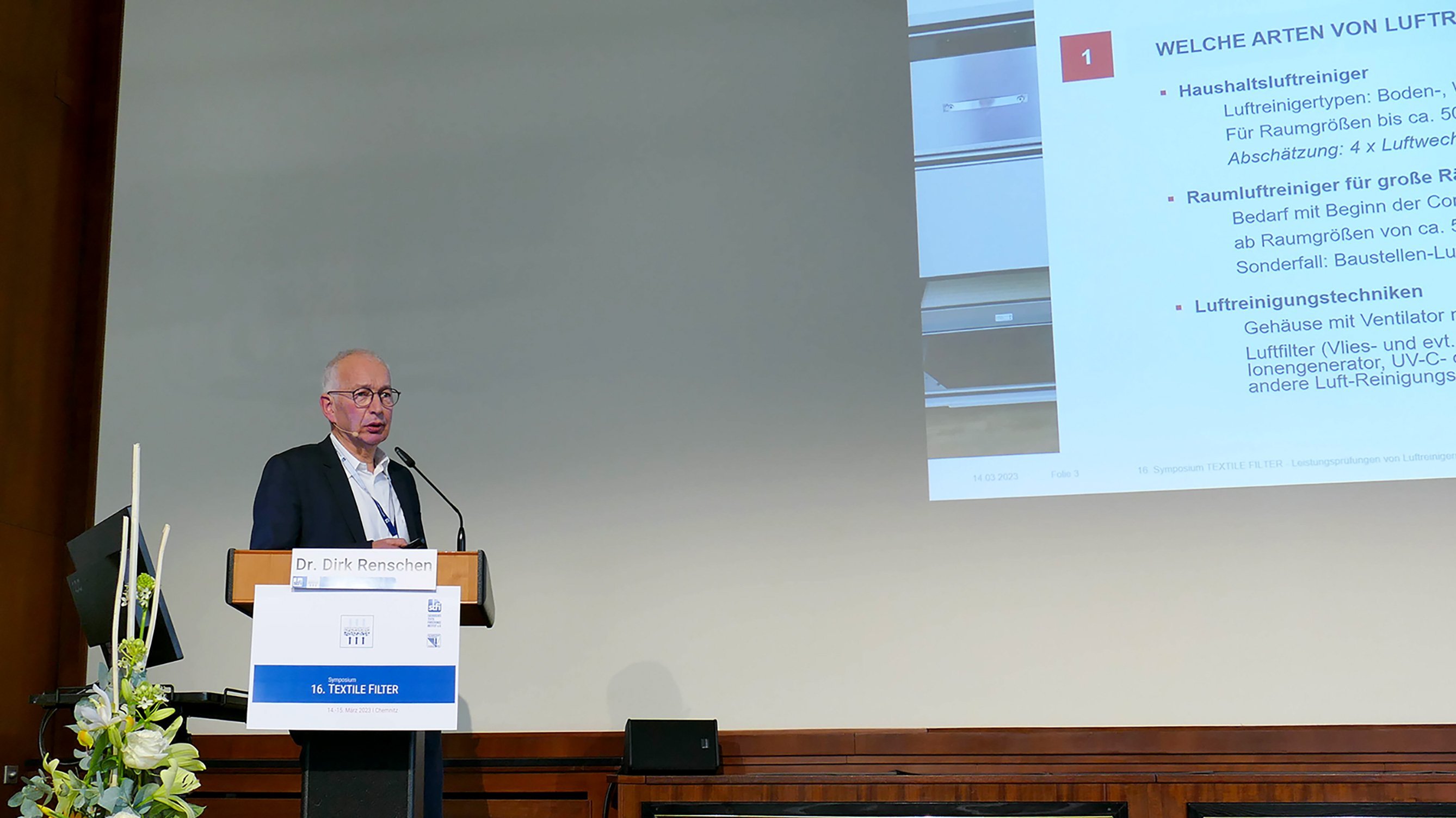 Ein weiter Themenkomplex des Symposiums widmete sich der Normung und Standardisierung der Filterprüfungen. Zu erwähnen sind hier die Prüfung von Luftfiltern in Kombination mit Brandschutz für Züge, die Prüfung von Luftfiltern für Haushalt, öffentliche Räume und Industrieanlagen oder die Entwicklung von Labortestverfahren zur beschleunigten Alterungsprüfung von mobilen Entstaubungsanlagen.