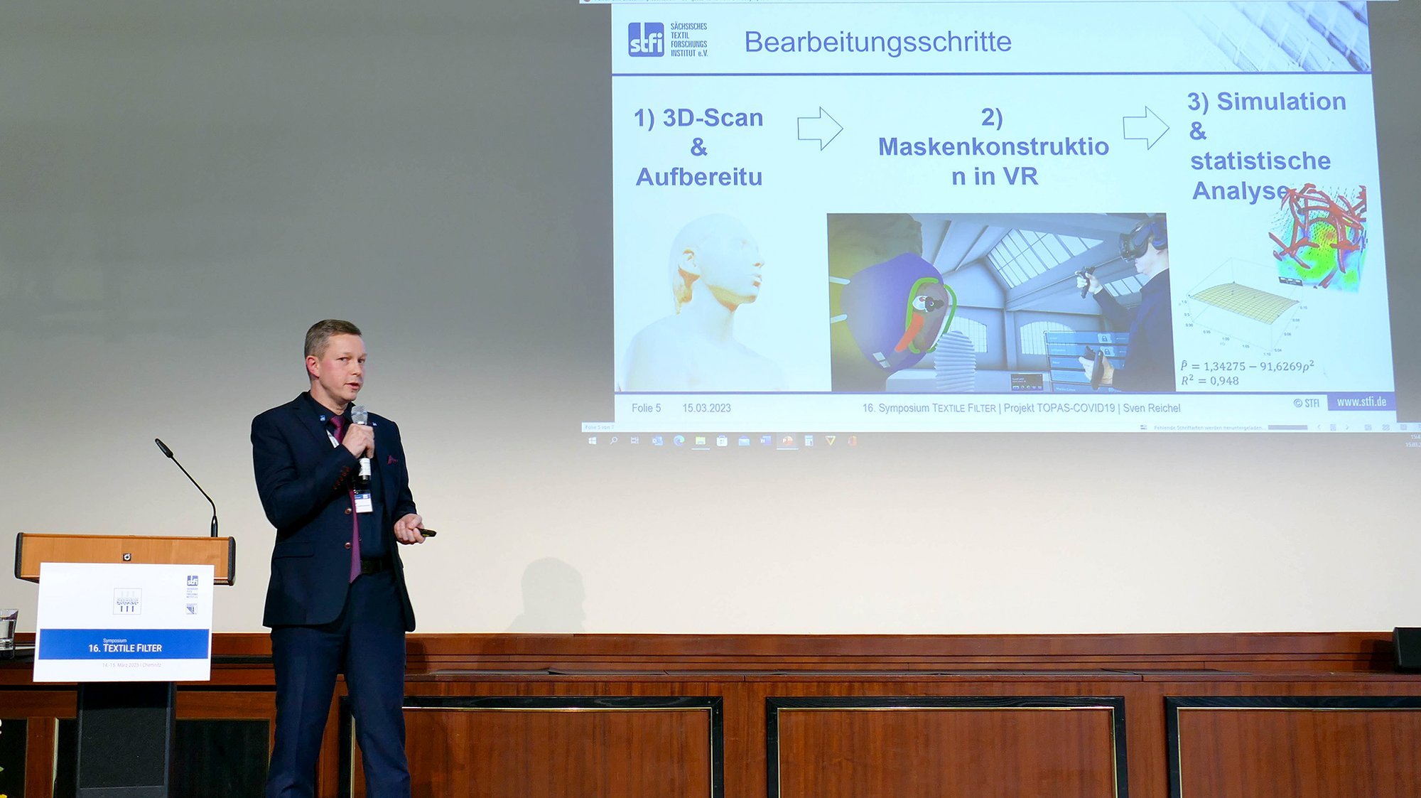 Abschließend stellte das STFI in eigener Sache geplante bzw. bereits realisierte Investitionen vor, die die technisch/technologische Basis und die Prüfkompetenz des Institutes erweitern. In Kurzvorträgen wurde die Errichtung einer Nassvliesanlage mit 600 mm Arbeitsbreite vorgestellt, die besonders für den Filterbereich und das Forschungsfeld Textilrecycling neue Entwicklungen ermöglichen wird. Für den Bereich Nähwirktechnik wurde eine neue Maliwatt- Maschine mit optimierter Arbeitsstelle investiert. Die Errichtung eines Prüfstandes für FFP2-Masken, der auch für die Prüfung von Filtern eingesetzt werden kann, erweitert die Prüfkompetenz des Hauses erheblich. Sein variabler Aufbau ermöglicht auch die Prüfung von neuentwickelten Vliesstoffen, deren Konstruktion durch Simulation optimiert wurde.