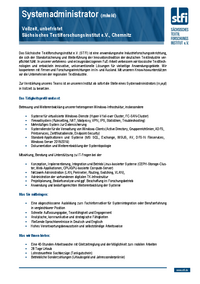 …Systemadministrator (m/w/d) Vollzeit, unbefristet Sächsisches Textilforschungsinstitut e.V., Chemnitz Das Sächsische Textilforschungsinstitut e.V. (STFI) ist eine anwendungsnahe Industrieforschungseinrichtung, die sich…