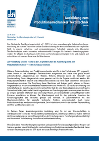 …ildung zum Produktionsmechaniker Textiltechnik (m/w/d) 22.04.2025 Sächsisches Textilforschungsinstitut e.V., Chemnitz www.stfi.de Das Sächsische Textilforschungsinstitut e.V. (STFI) ist eine anwendungsnahe…
