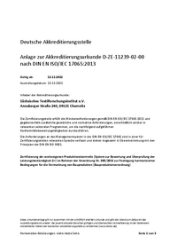 … der Akkreditierungsurkunde: Sächsisches Textilforschungsinstitut e.V. Annaberger Straße 240, 09125 Chemnitz Die Zertifizierungsstelle erfüllt die Mindestanforderungen gemäß DIN EN ISO/IEC 17065:2013 und…