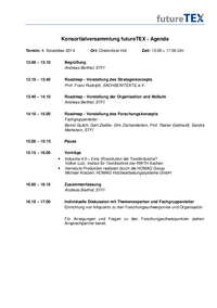 …Konsortialversammlung futureTEX - Agenda Termin: 4. November 2014 Ort: Chemnitzer Hof Zeit: 13.00 – 17.00 Uhr 13.00 – 13.10 Begrüßung Andreas Berthel, STFI 13.10 – 13.40 Roadmap - Vorstellung des Strategiekonzepts…