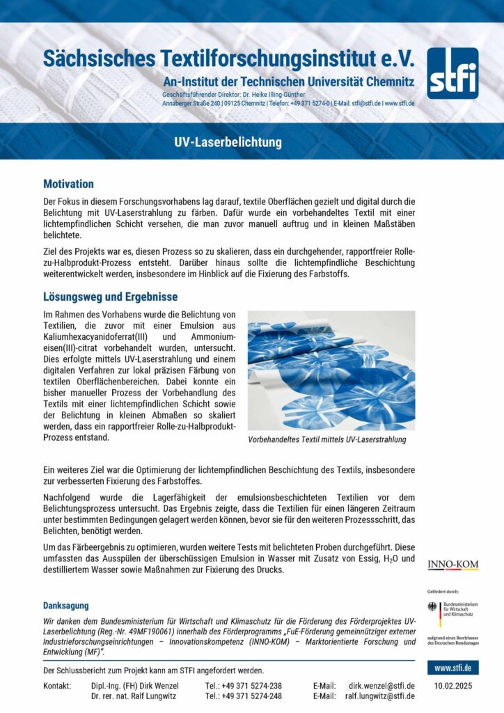 Der Fokus in diesem Forschungsvorhabens lag darauf, textile Oberflächen gezielt und digital durch die Belichtung mit UV-Laserstrahlung zu färben. Dafür wurde ein vorbehandeltes Textil mit einer lichtempfindlichen Schicht versehen, die man zuvor manuell auftrug und in kleinen Maßstäben belichtete.